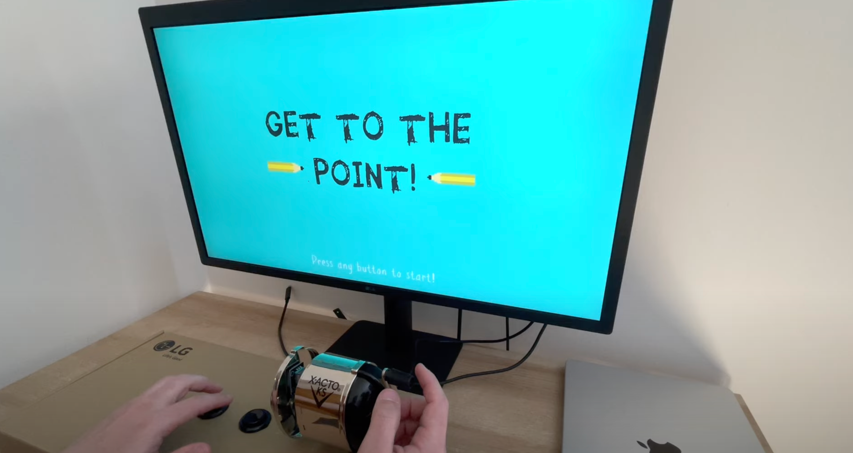 “Get to the Point” repurposes an old-fashioned crank pencil sharpener as a physical controller, challenging players to rotate and “sharpen” oncoming pencils before they time out in a whimsical, arcade-style game.